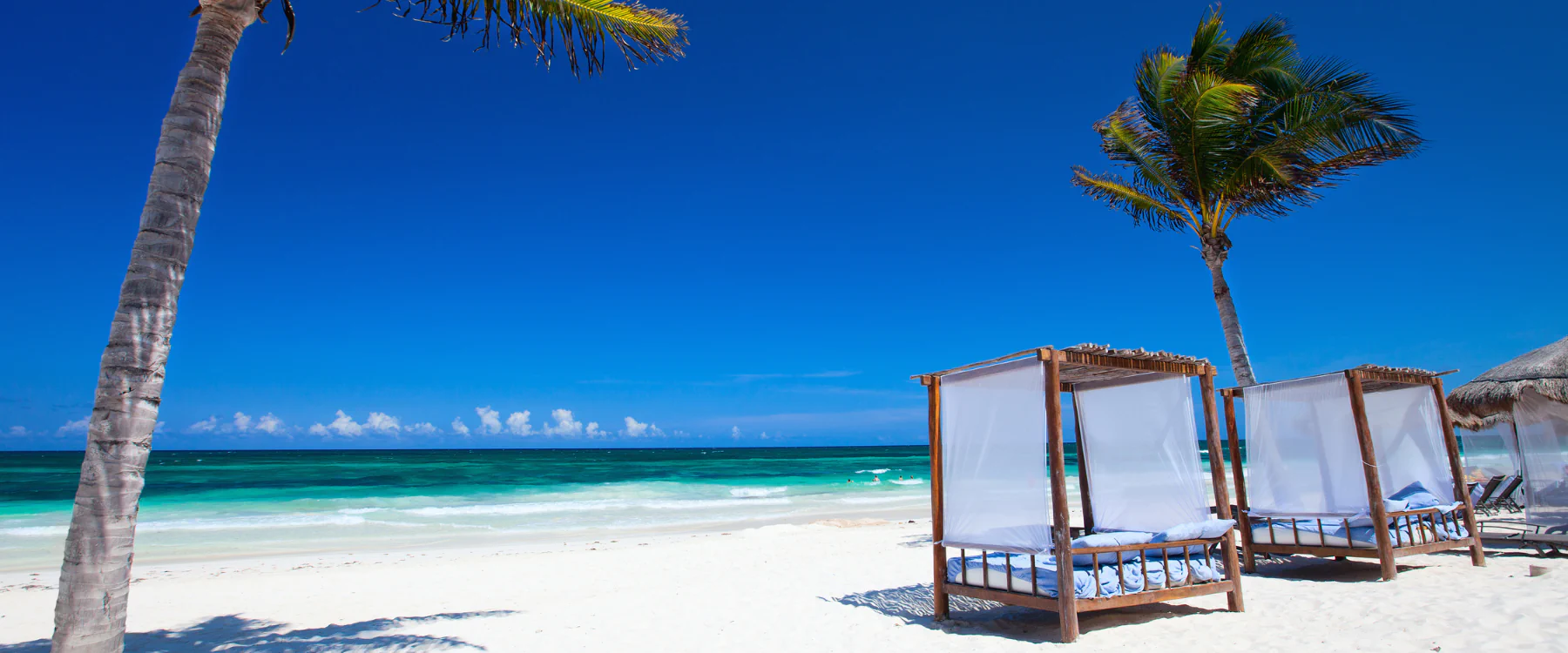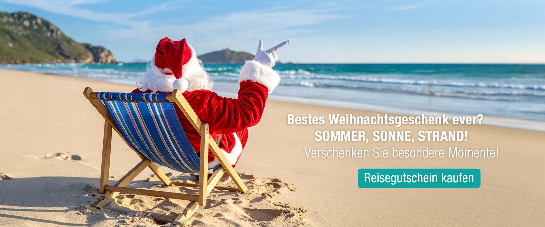 Onlineangebot zum Devisenwechsel über die Reisebank. Eine lächelnde Person mit dunklen, lockigen Haaren und einer runden Sonnenbrille sitzt entspannt in einem Liegestuhl an einem sonnigen Strand. Im Hintergrund sind der helle Sandstrand, das blaue Meer und ein klarer Himmel zu sehen, was eine Urlaubsatmosphäre vermittelt.
