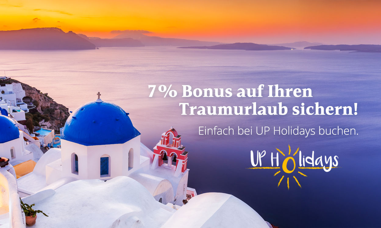 Eine Werbekachel des Veranstalters UP Holidays, die exklusive Vorteile verspricht. Ein Kind mit blauer Taucherbrille und Schnorchelmaske blickt unter Wasser direkt in die Kamera und formt mit beiden Händen ein 'Peace'-Zeichen. Die Wasseroberfläche mit Sonnenlichtreflexionen ist im oberen Bildbereich sichtbar, und das Wasser hat eine helle, türkise Farbe.